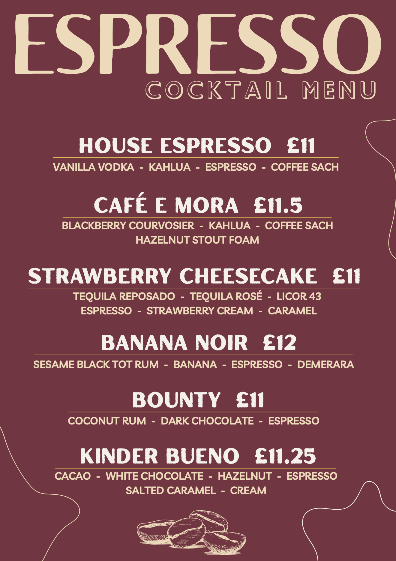 Menus Main Menu Drinks Menu Sunday Roast Menu Restaurant Welcome Drinks Christmas Menu Bottomless Brunch Espresso Coctails Sunday Tapas Roulette